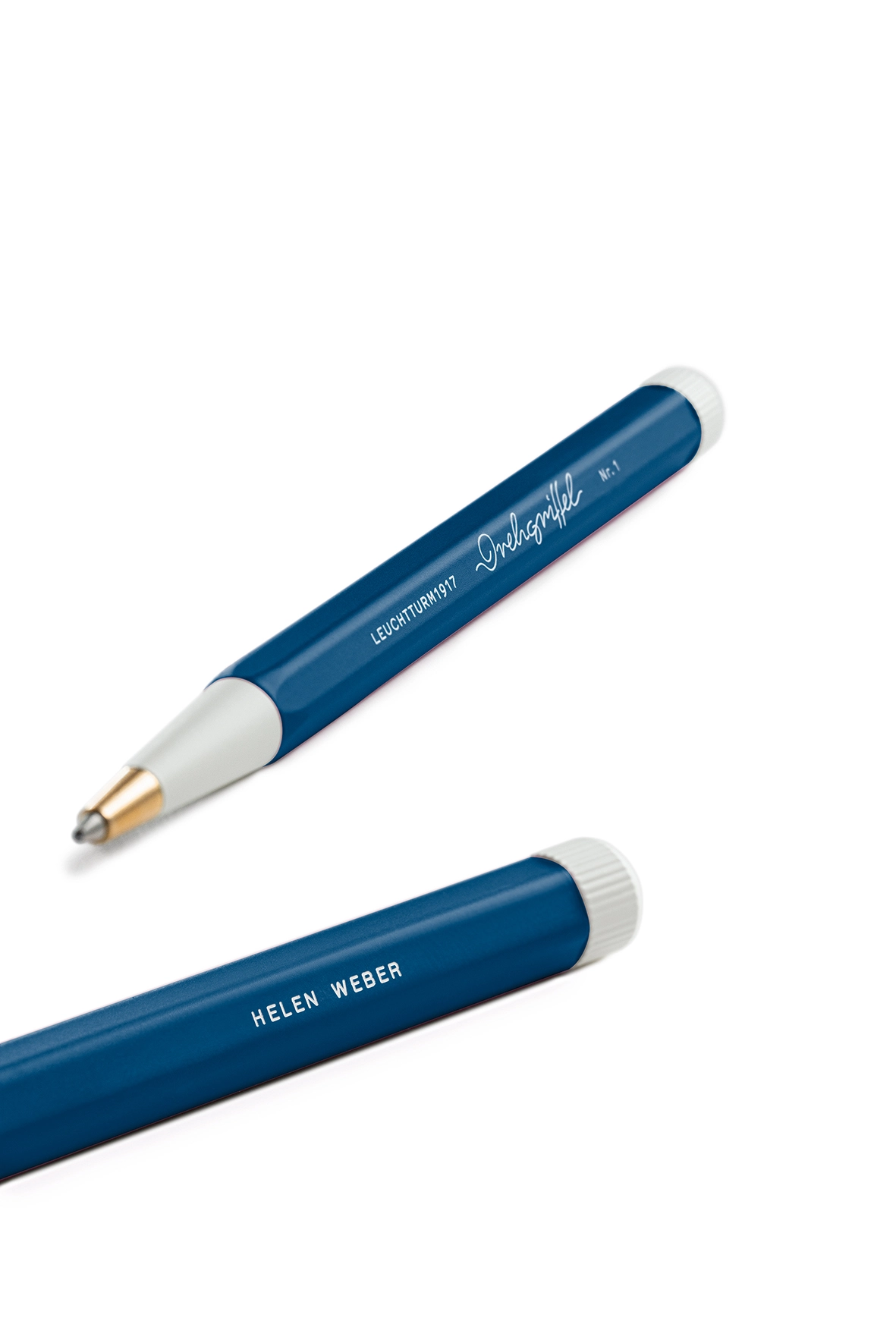 Two blue and white Drehgriffel Nr. 1 with engraving “Helen Weber”.